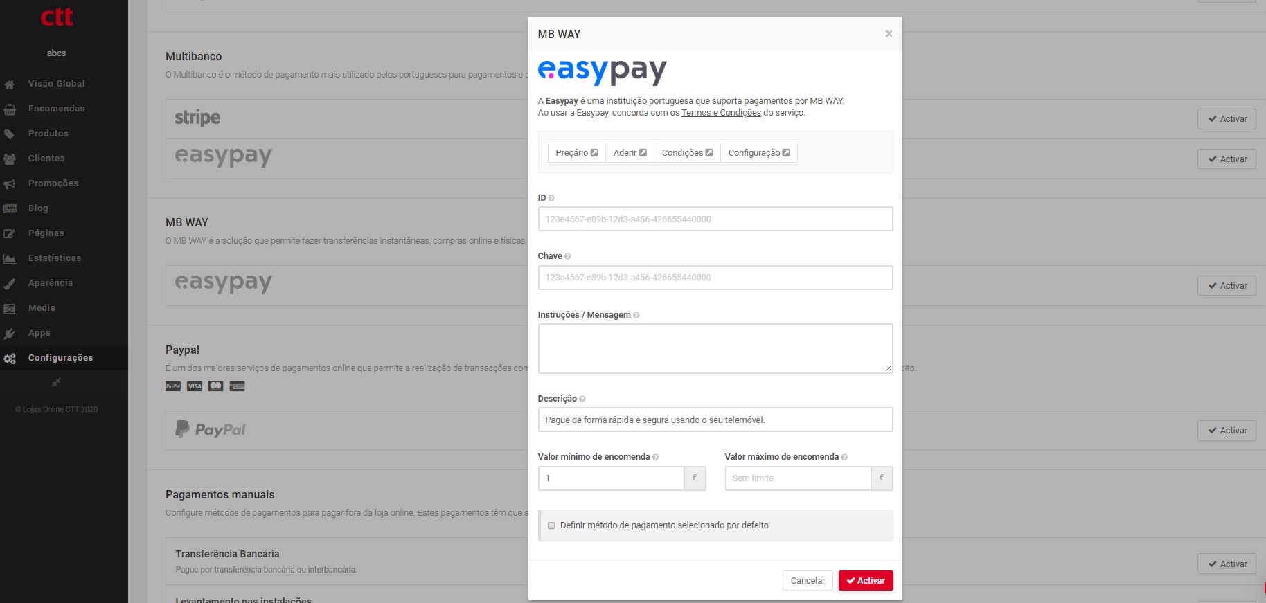 Aceda ao menu Configurações / Pagamentos e ative o método de pagamento MB Way Easypay.