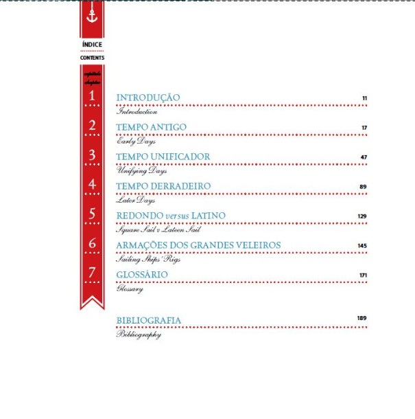 Esta edição bilingue, da autoria de António Manuel Gonçalves e ilustrações de José Cabrita, traça a história da navegação à vela, numa viagem cronológica em três tempos – “tempo antigo”, “tempo unificador” e “tempo derradeiro”. No primeiro, são reveladas as técnicas de construção dos navios, que surgiram e evoluíram em diferentes lugares; no segundo, as diversas “escolas” que foram colocadas em contacto, proporcionando evoluções súbitas que levaram à melhoria e ao aparecimento de novos tipos de navios; e no terceiro, a evolução científica e tecnológica que permitiu a descoberta e a utilização de materiais e técnicas inovadoras, levando à construção de grandes veleiros e ao seu derradeiro patamar.