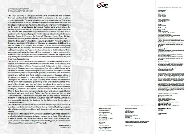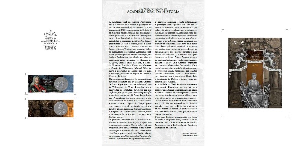 Pagela com Série e Bloco 300 anos Fundação da Academia Real da História