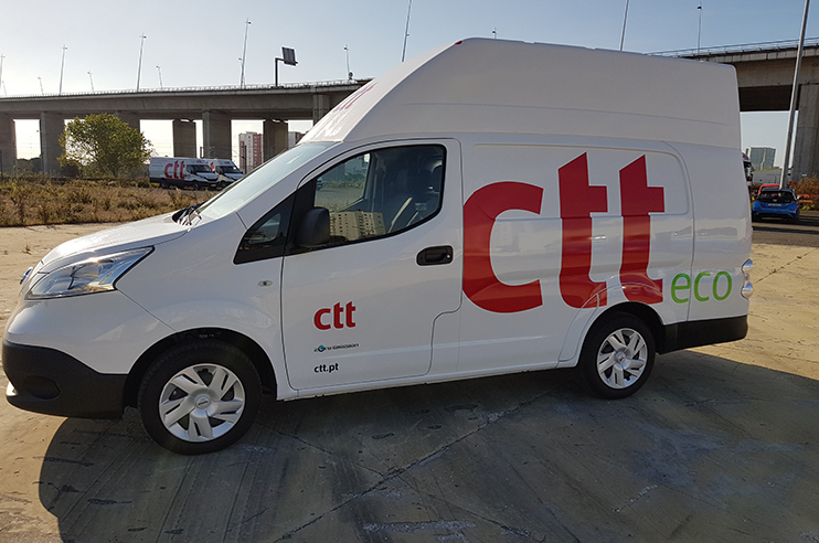 Veículo elétrico Nissan e-NV200 XL Os CTT são a primeira empresa portuguesa a testar o veículo Nissan e-NV200 XL para distribuição (last-mile), um veículo que foi transformado à medida do setor postal e que não existe atualmente em circulação no nosso país.