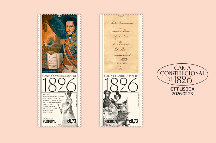 23 fevereiro Carta Constitucional de 1826 Emissão: 2026/ 02/23 Obliterações do 1.º dia em: Lisboa, Porto, Funchal, Ponta Delgada Selos: 2 x €0,73 Design: Folk Design Papel: 110g/m2 Formato: Selos: 30,6 x 80 mm Picotagem: 12 x 12 ¼ e Cruz de Cristo Impressão: offset Impressor: Cartor Folhas com 25 ex.